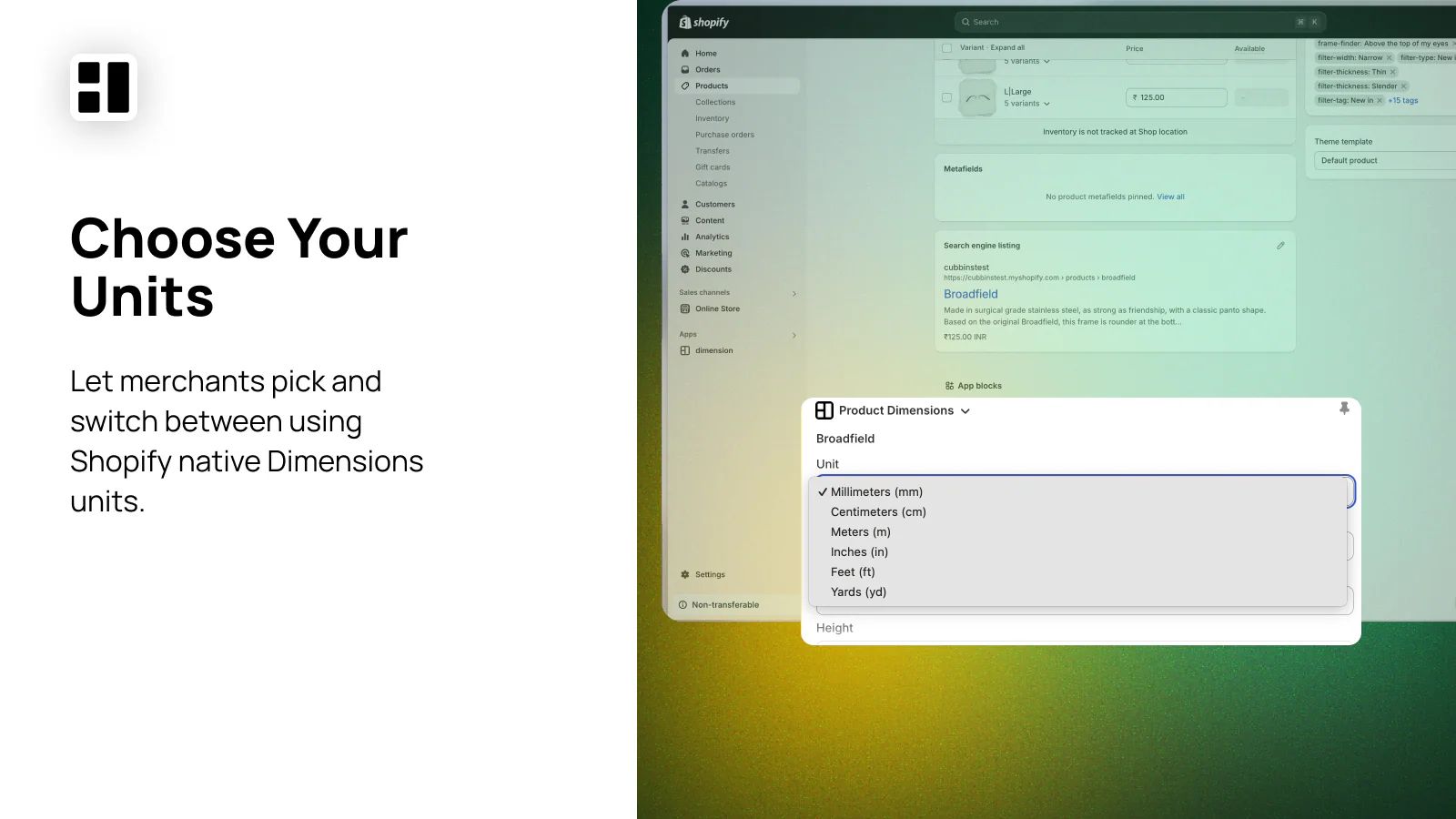- Native field storage - Dimensions are stored in Shopify’s native fields, ensuring data portability and accessibility